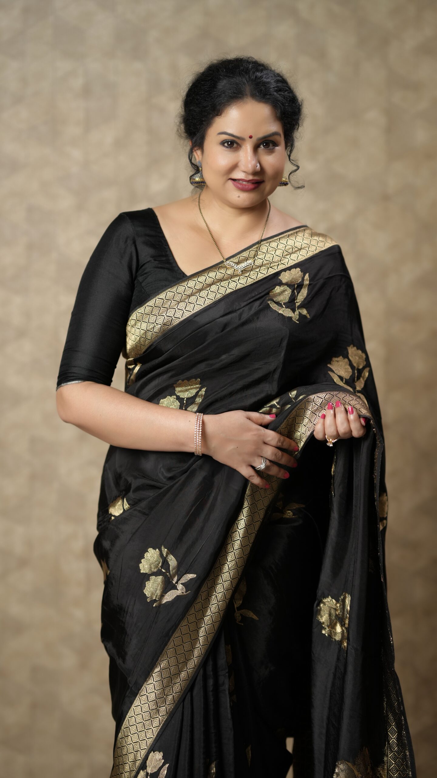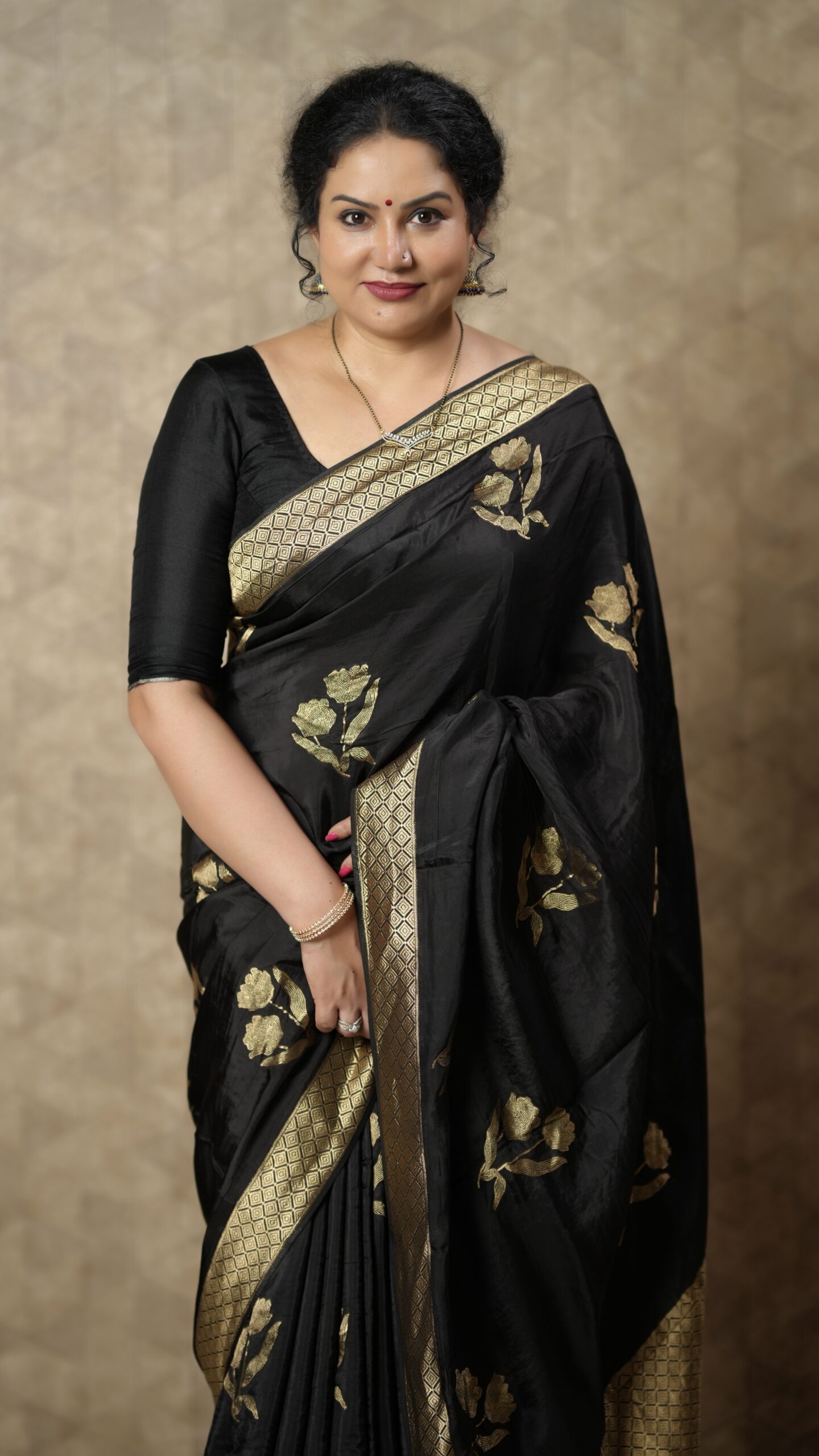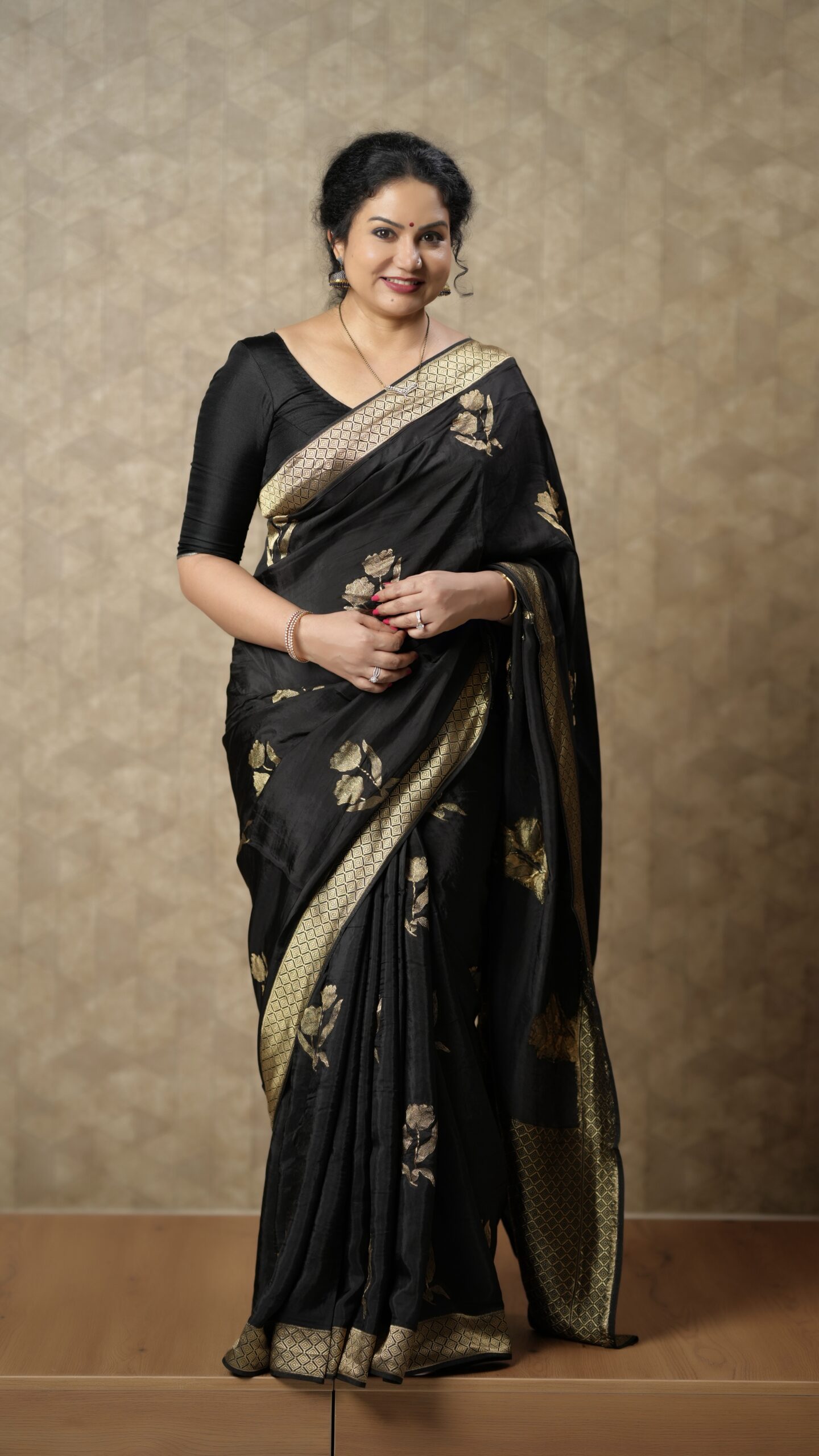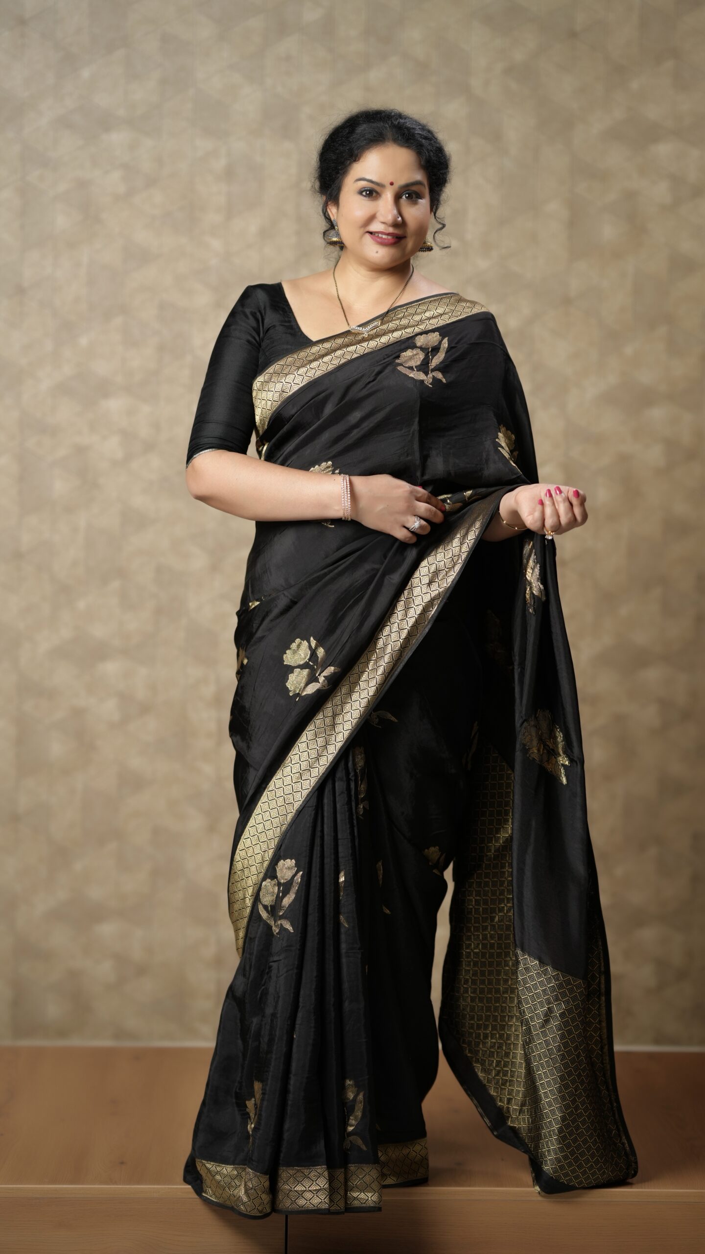 Black Silk Saree with Gold Zari Floral Motifs