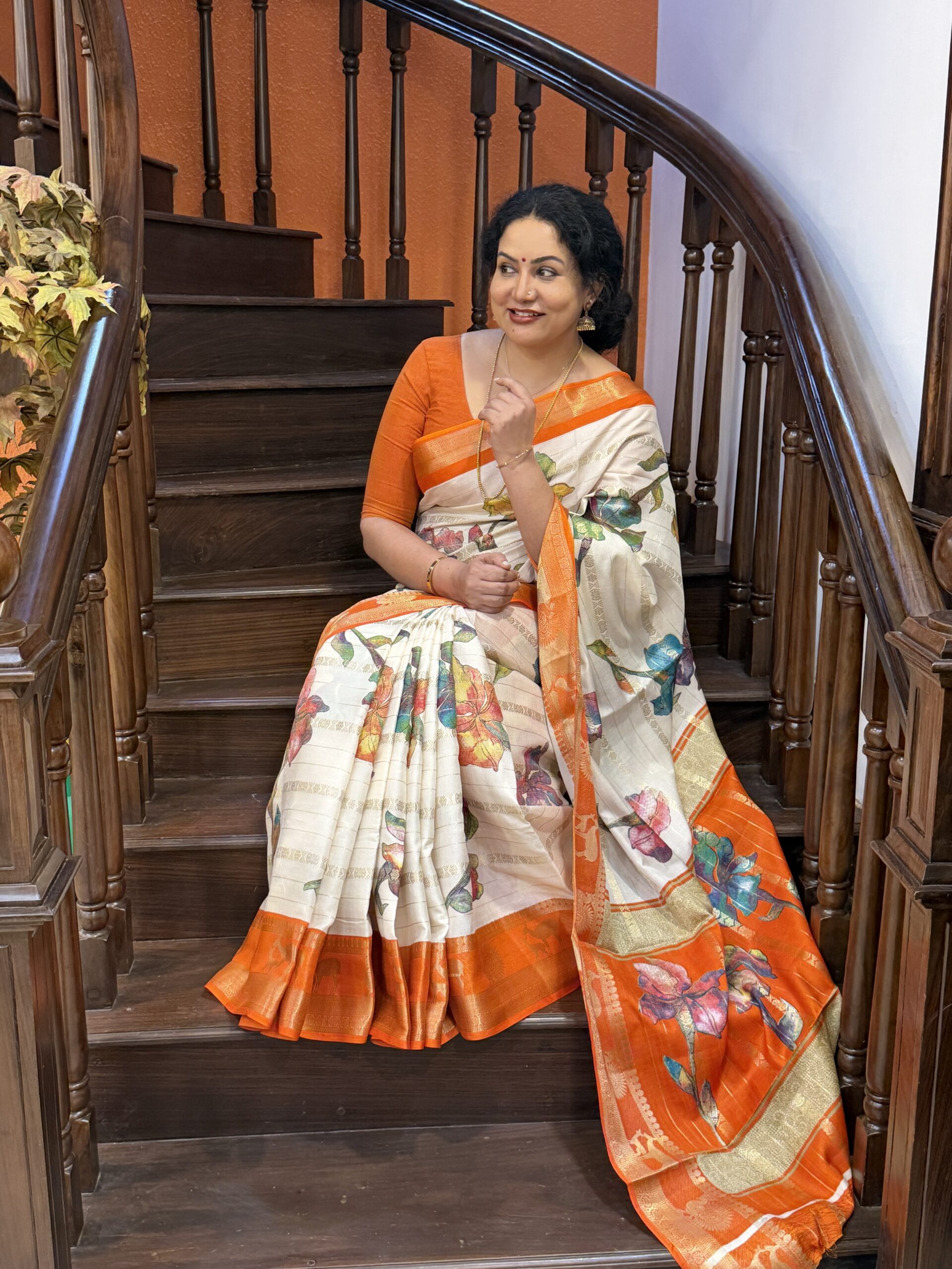 Soft and elegant, this rose silk saree features a soothing cream base adorned with vibrant orange floral prints that bring warmth and charm to the overall look. The smooth texture of rose silk offers a graceful drape with a subtle sheen, making it both comfortable and refined.