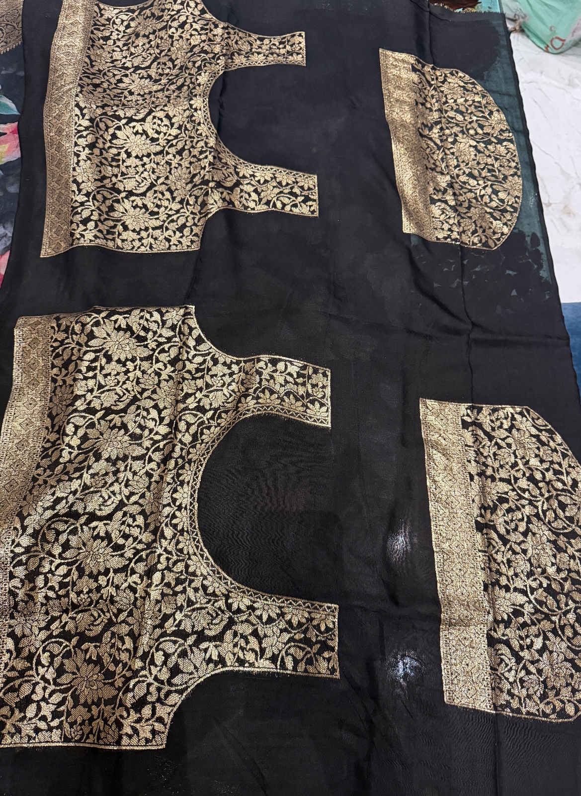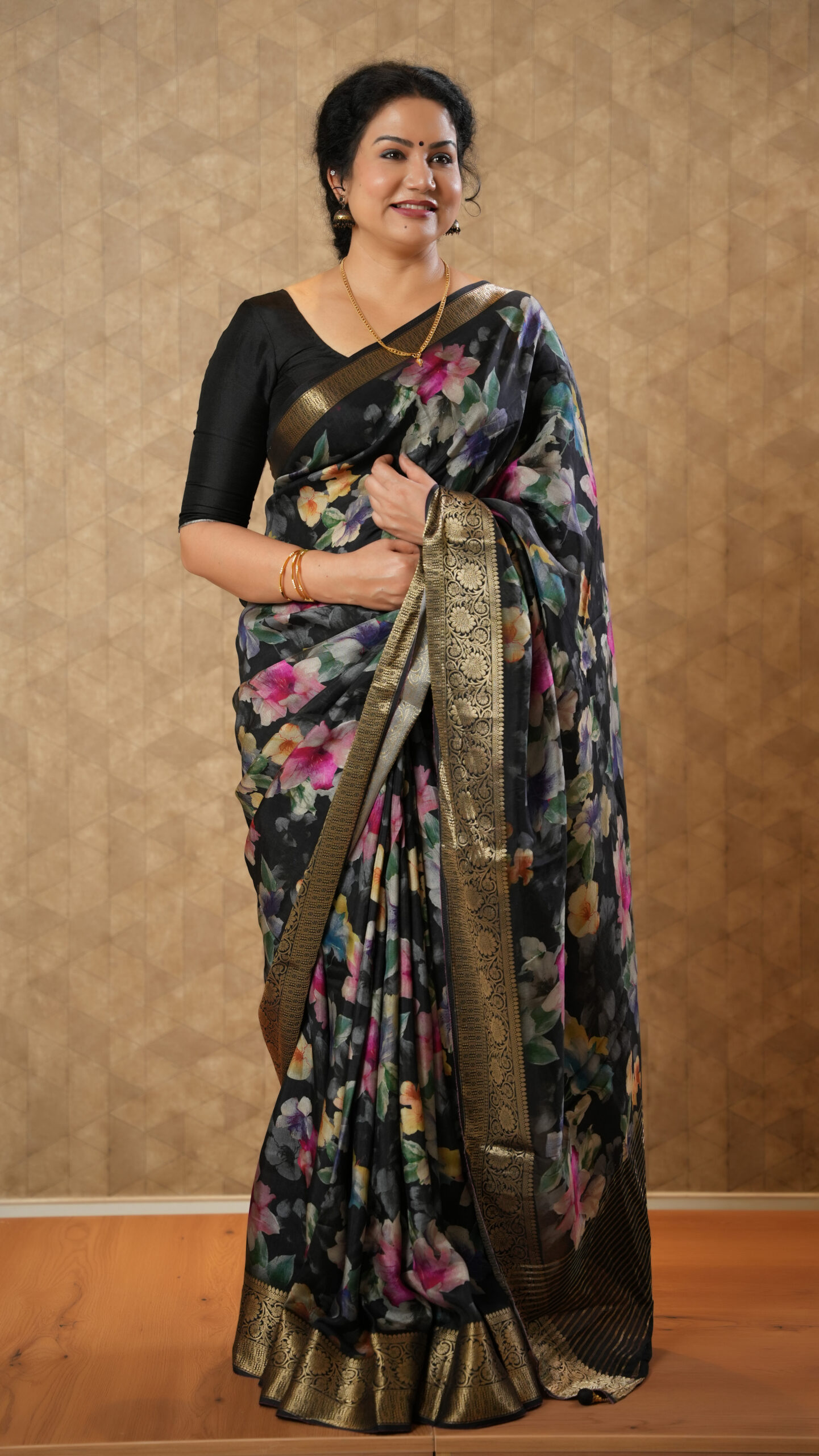 Deep black crepe silk saree crafted from a lightweight, breathable, and flowy fabric. Adorned with a vibrant multicolour floral design and finished with an intricately woven golden zari border for a touch of timeless elegance.Related Product