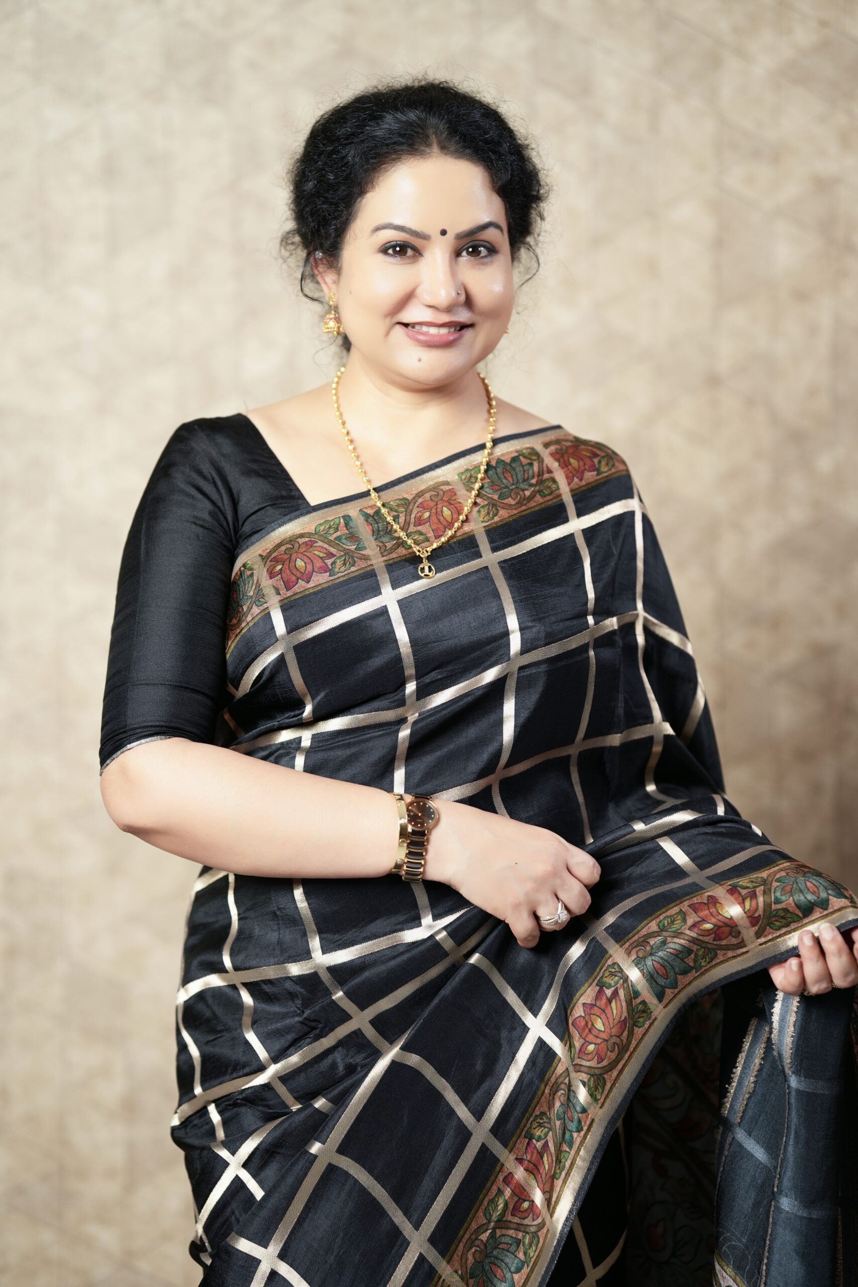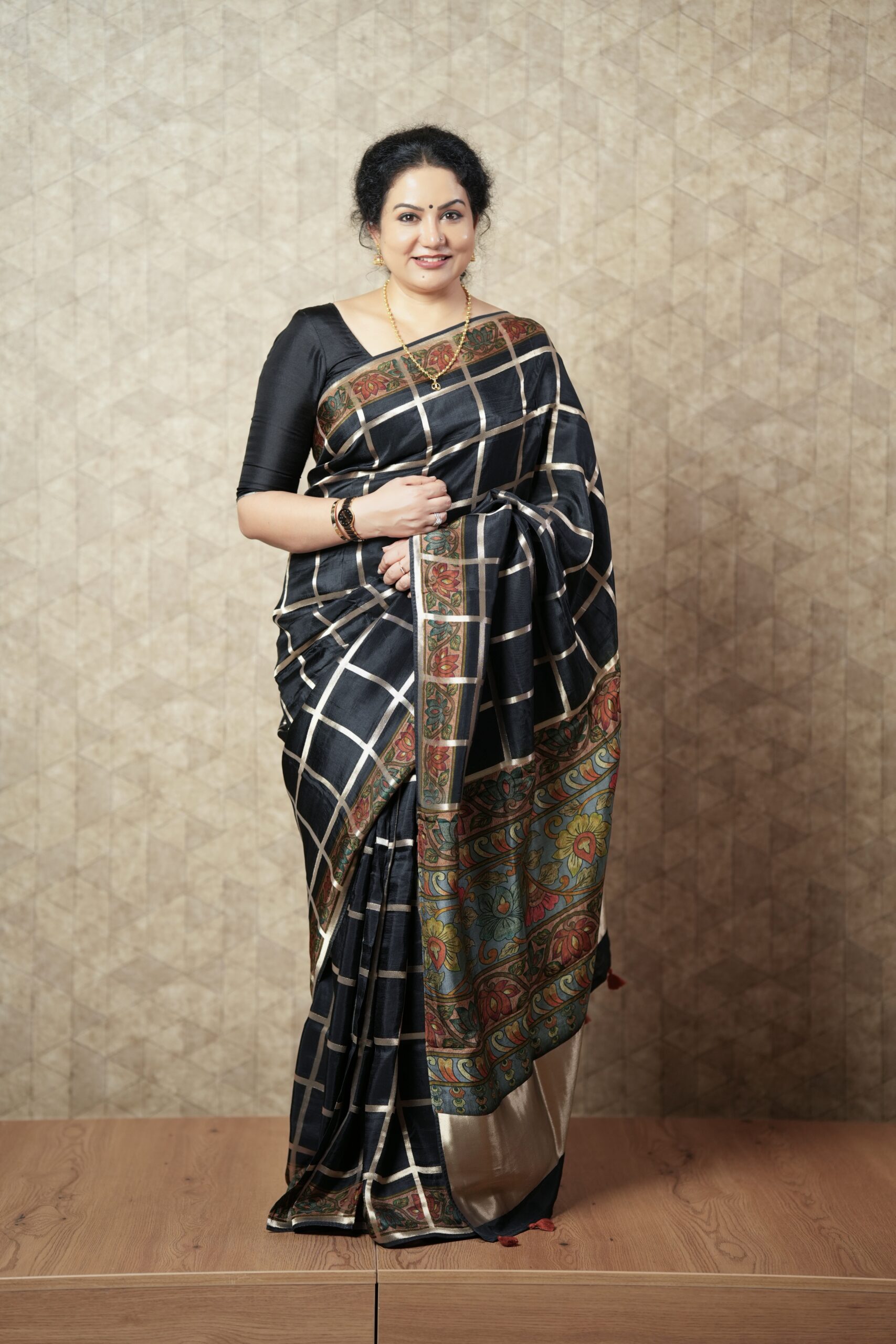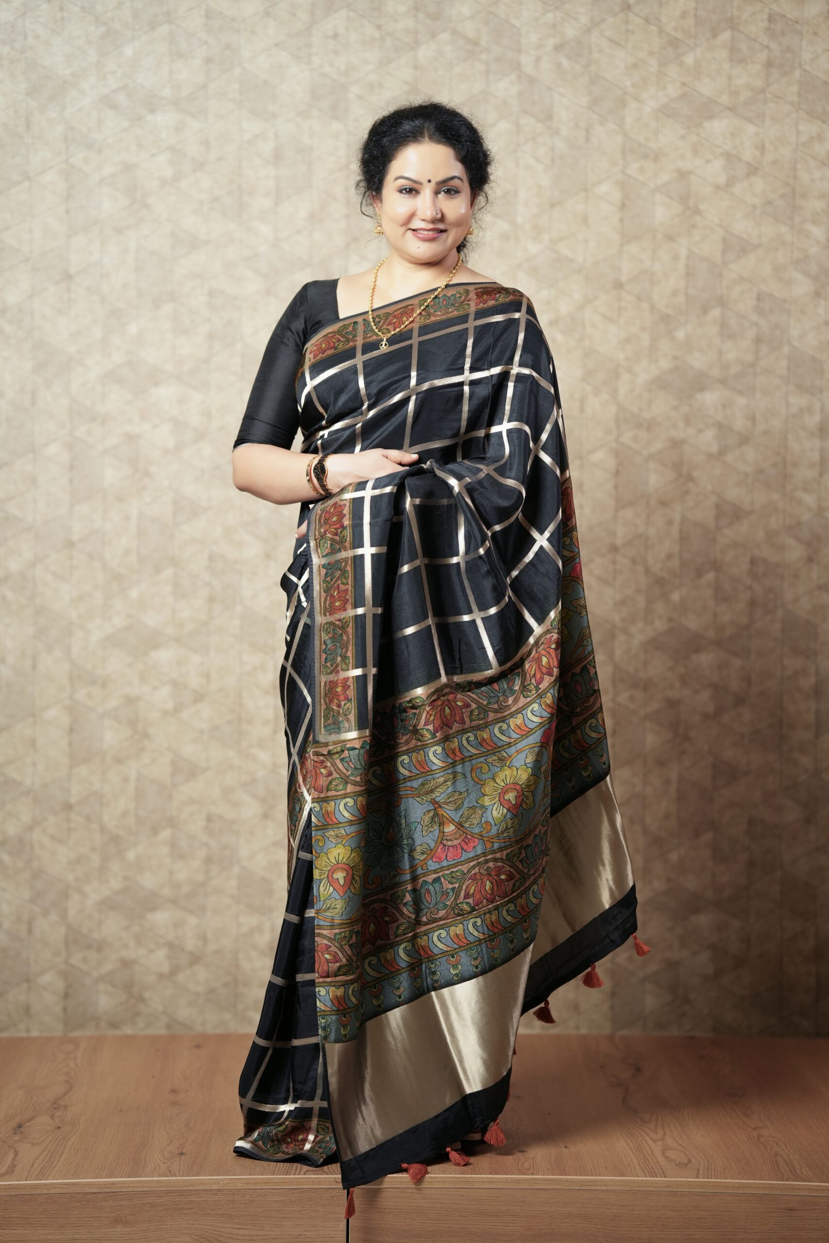 Chic and timeless, this deep black saree is crafted from a flowy silk blend that offers a graceful drape and a refined finish. The subtle checked design adds a contemporary touch while maintaining a classic appeal.