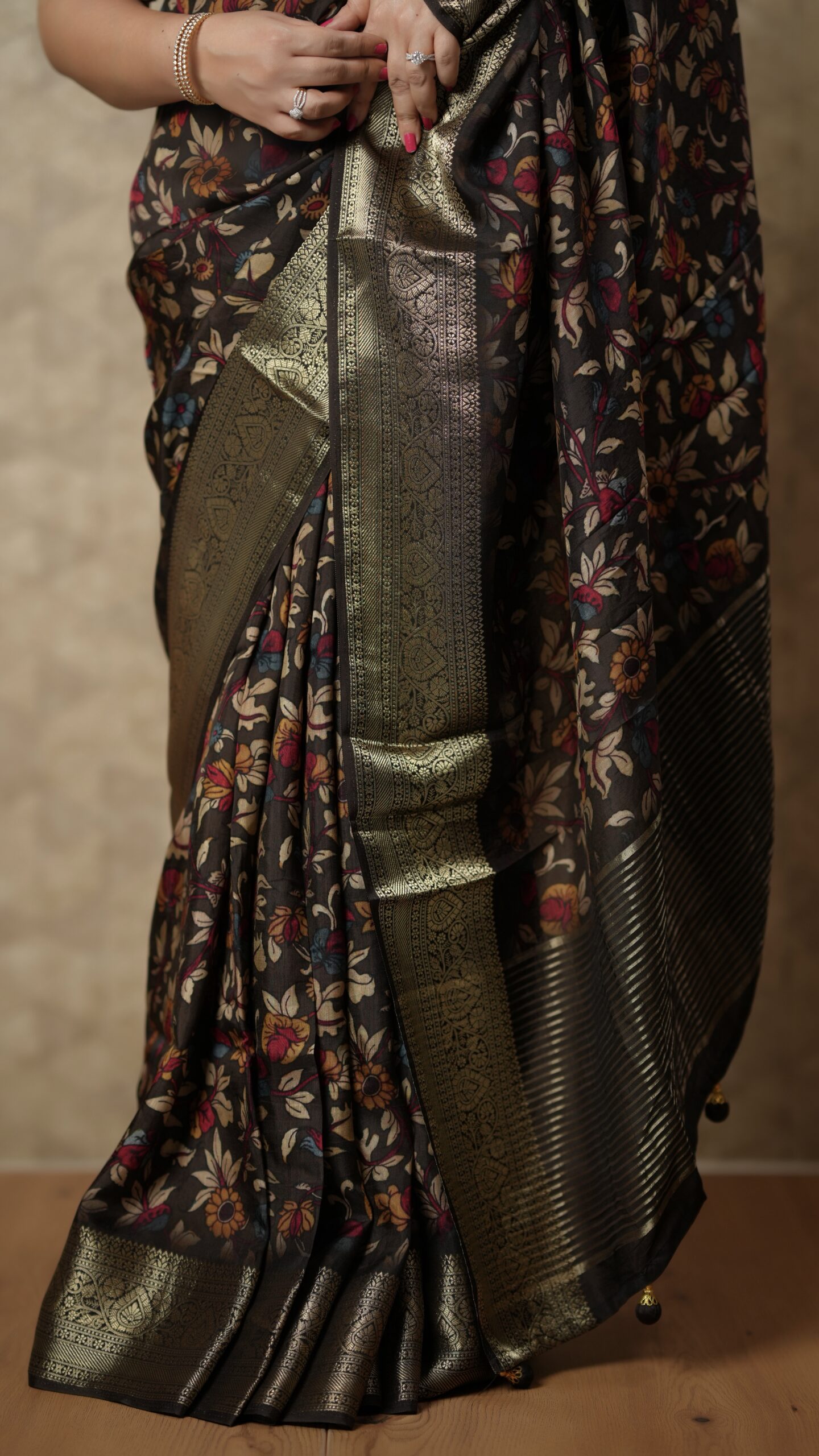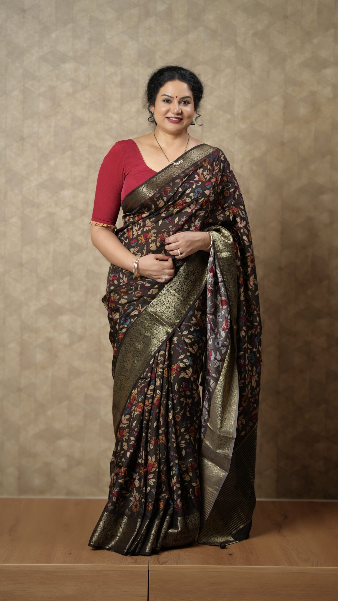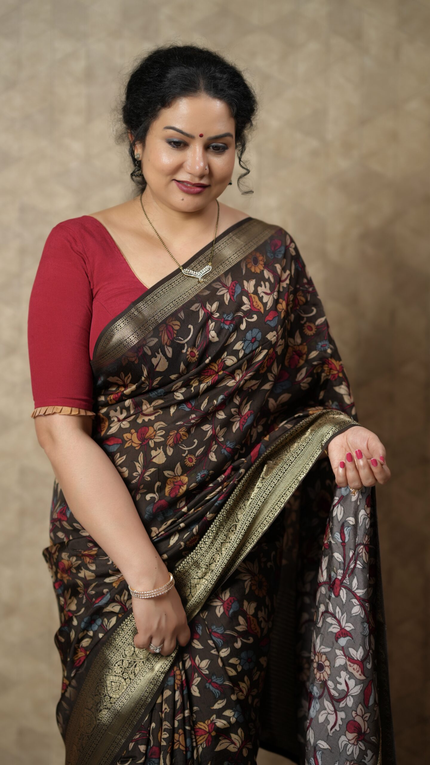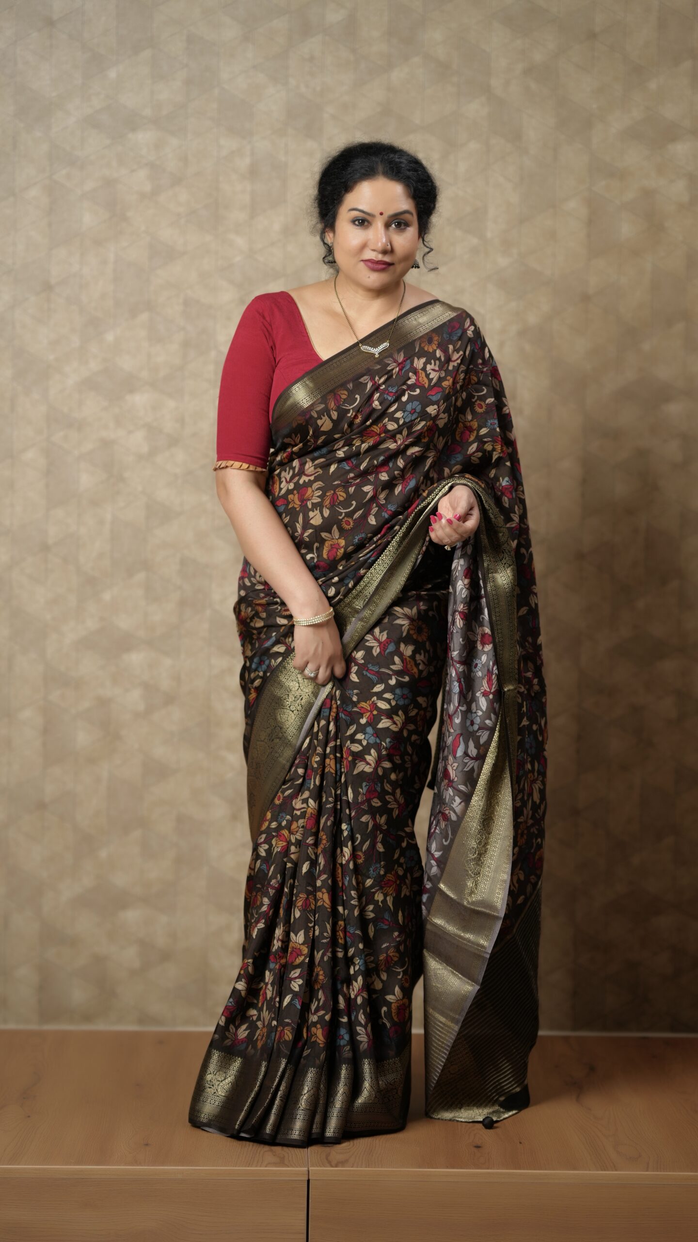 Sophisticated and stylish, this deep chocolate brown crepe silk saree is designed to elevate your festive wardrobe. The soft, flowy texture of crepe silk offers a graceful drape, while the body features charming multicolour floral prints that add vibrancy and elegance.