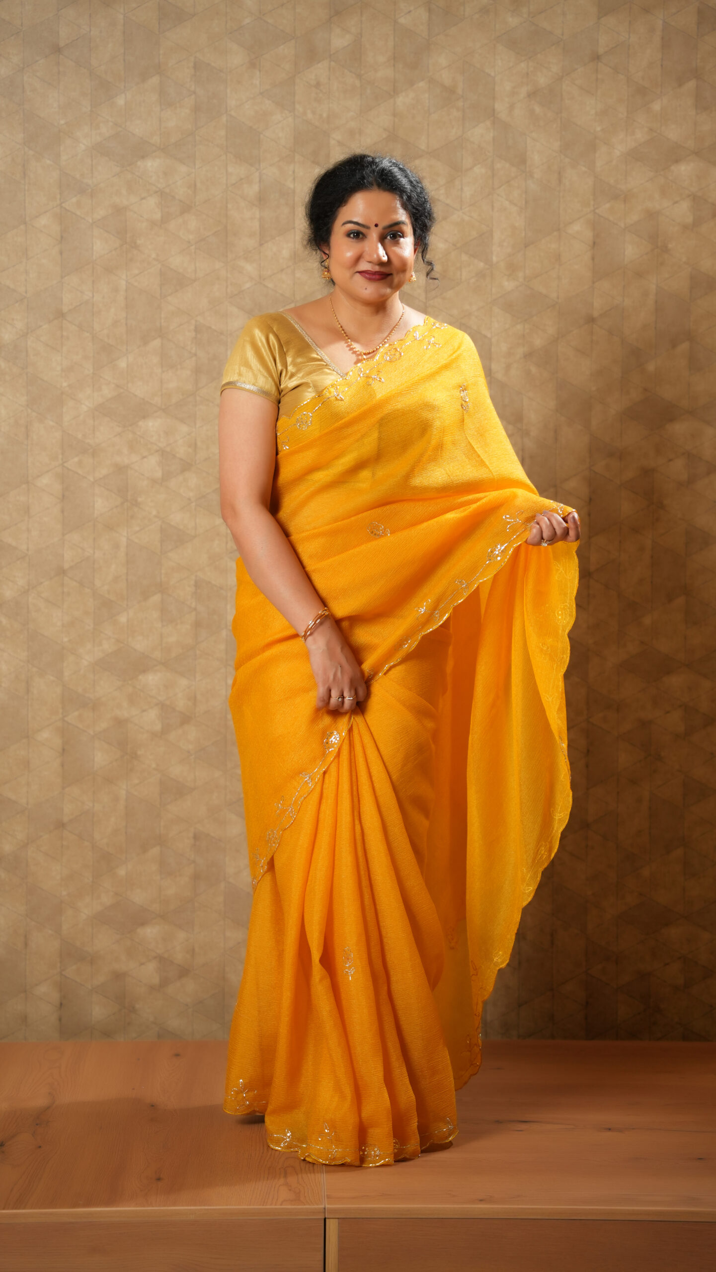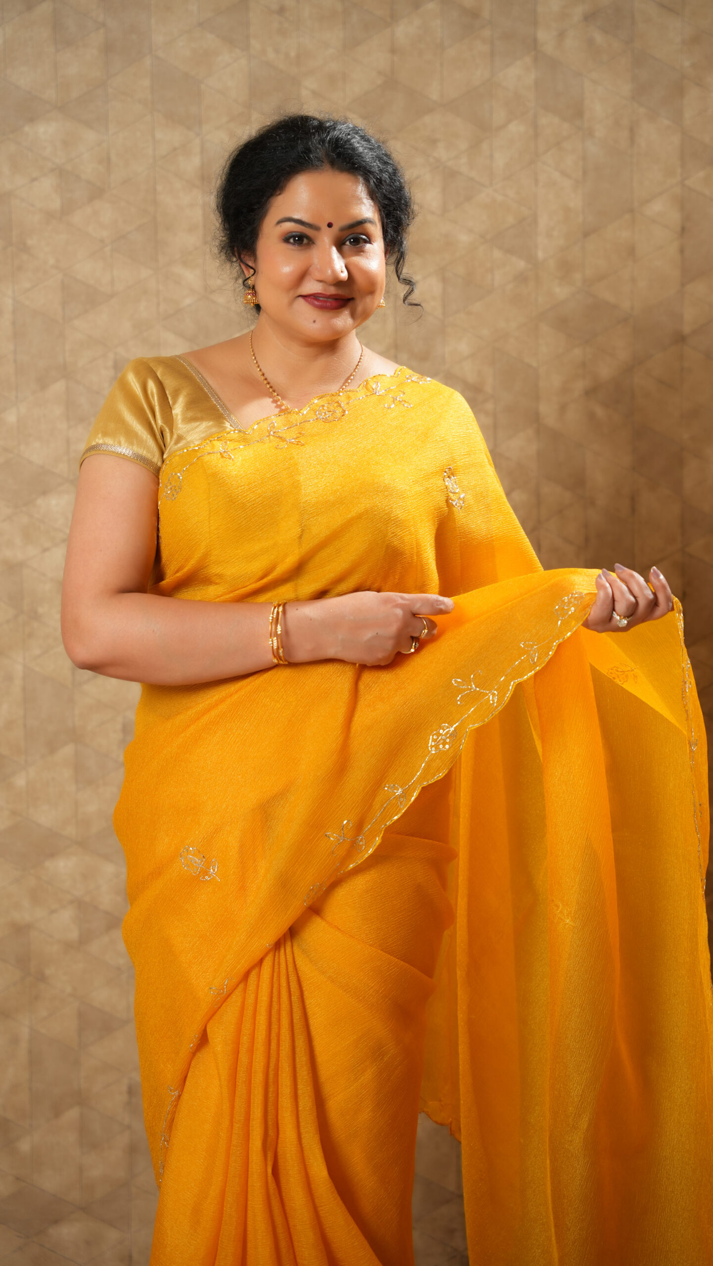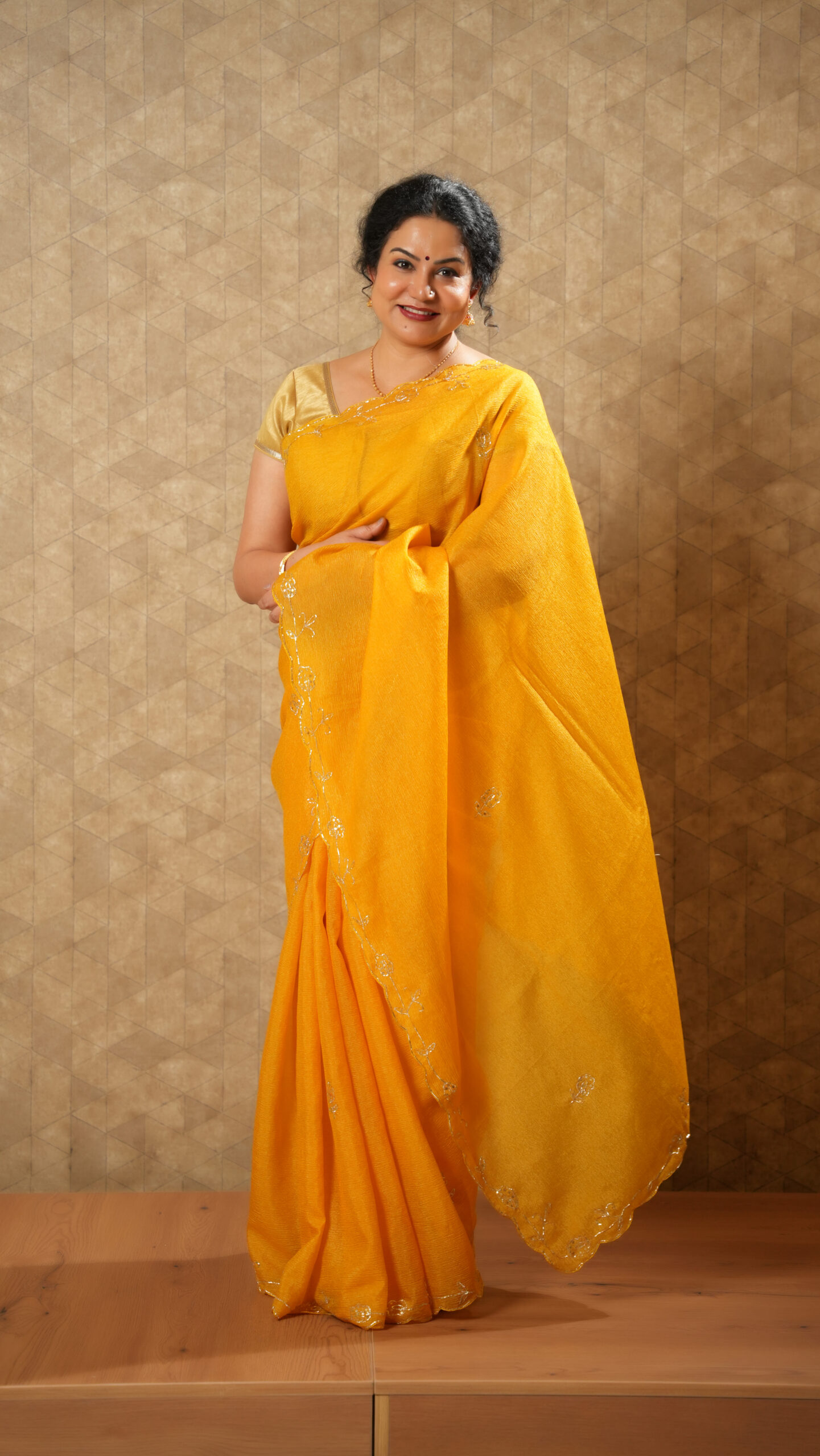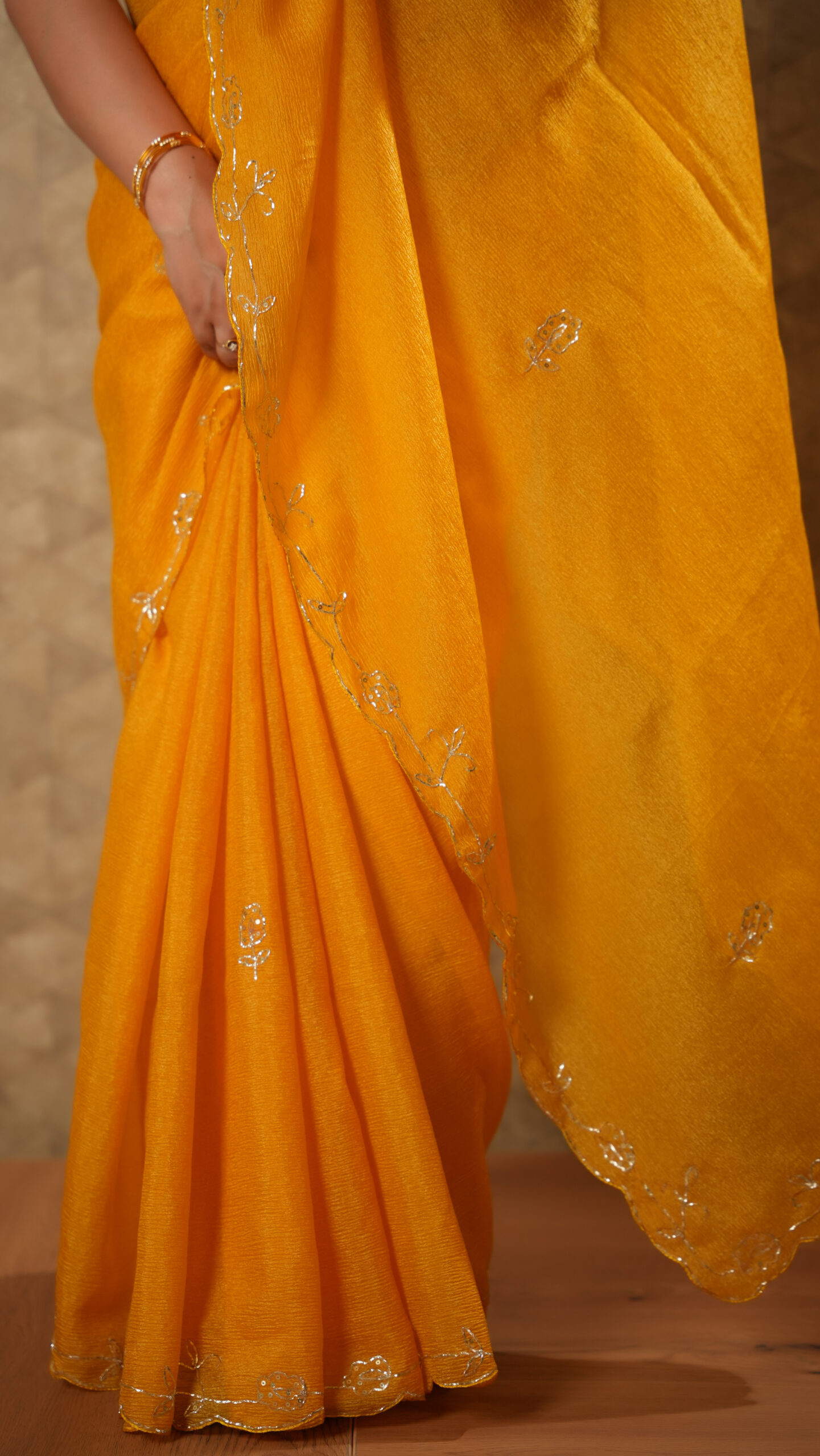 Bright and beautiful, this vibrant mustard yellow saree is crafted from a soft crushed silk blend that offers a lightweight, textured, and graceful drape. The saree features delicate thread-embroidered leaf motifs along the border, adding a subtle yet refined touch of artistry.