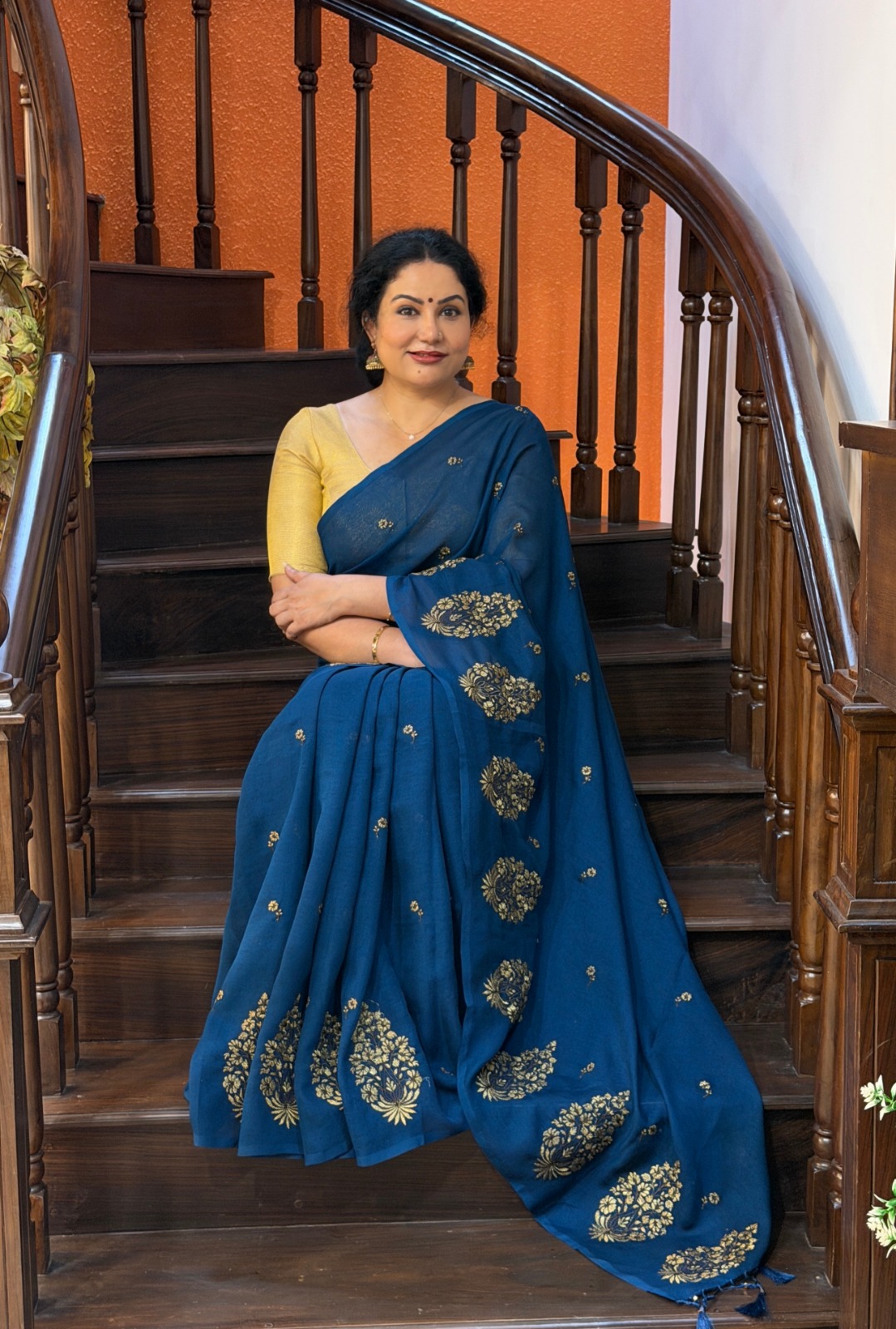 The highlight of this saree is its intricate golden embroidery work, adding a royal and festive touch to the earthy elegance of linen jute. The rich detailing enhances its overall appeal, making it an ideal choice for weddings, festive celebrations, cultural events, and special gatherings.