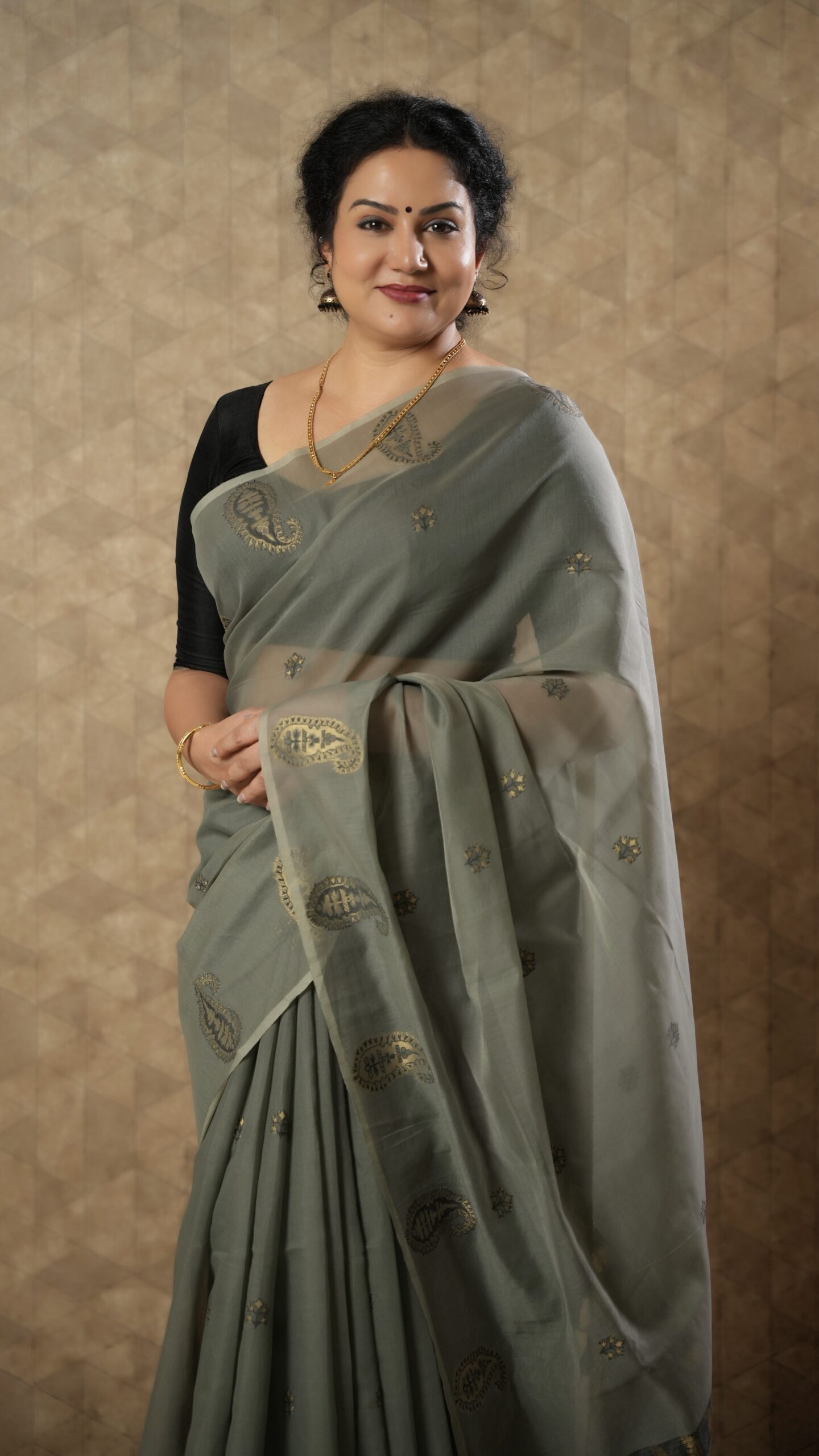 Soft, graceful, and ethereal — this muted sage green organza silk blend saree features a sheer, translucent texture that drapes with effortless elegance. The body is adorned with finely woven gold zari paisley motifs paired with delicate floral buttas, creating a beautiful balance of tradition and subtle sophistication.