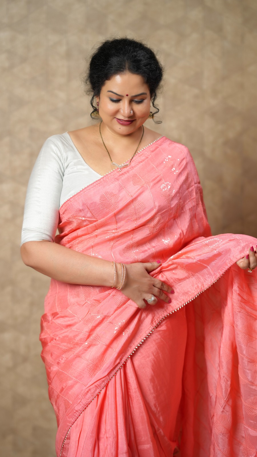 This elegant Soft Peach Pink Dola Silk saree features a beautifully woven leaf-pattern design crafted with fine thread embroidery.